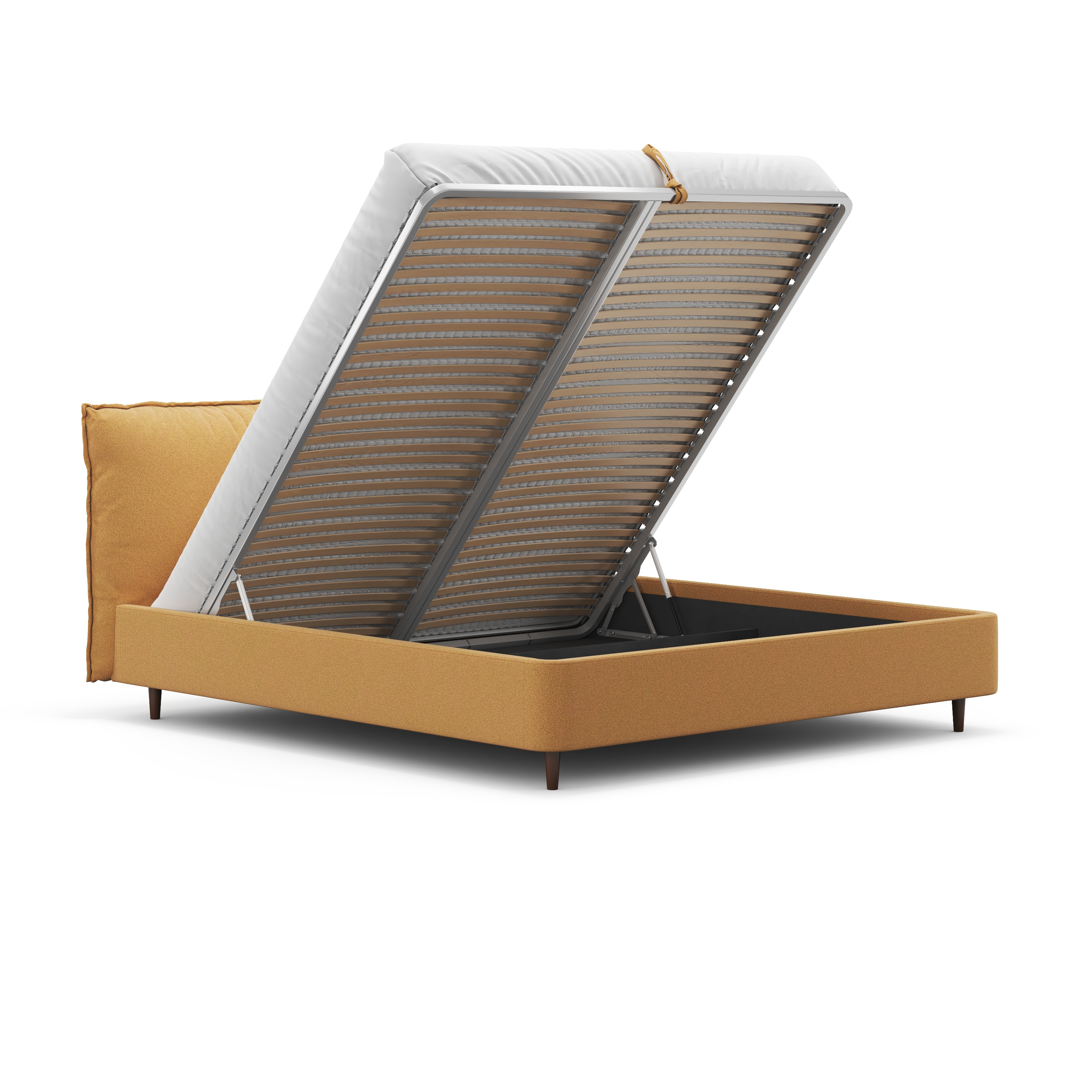 Но главной изюминкой является подъемный механизм, открывающий доступ к вместительному отделению для хранения вещей (оно есть даже в варианте на ножках!). Теперь вы можете рационально использовать пространство спальни и упорядоченно хранить постельное белье и сезонные вещи. Турецкие премиальные амортизаторы подъема обеспечивают плавное и бесшумное открывание и позволяют фиксировать положение в любой точке хода.